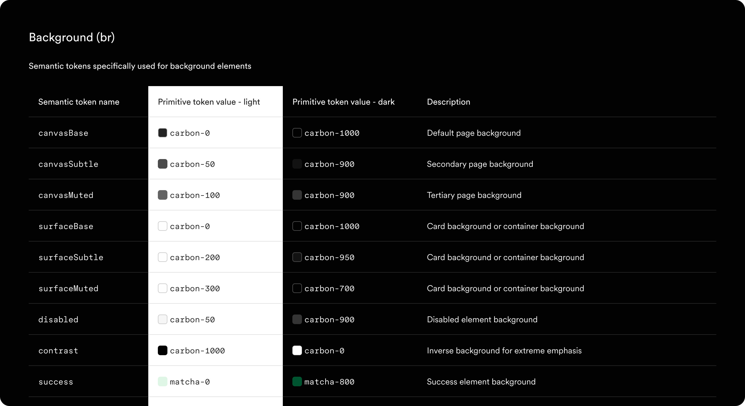 List of color tokens