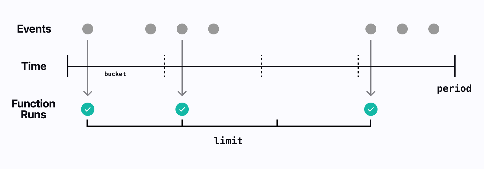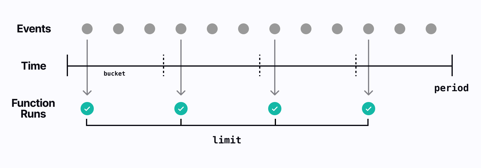 For example, this means that for a limit: 10 and period: '60m' (60 minutes), the bucket time window will be 6 minutes. Any event triggering the function "fills up" the bucket for that time window and any additional events are ignored until the bucket's time window is reset. The algorithm (GCRA) is more sophisticated than this, but at the basic level - rateLimit ensures that you'll only run the max limit number of items over the period that you specify.